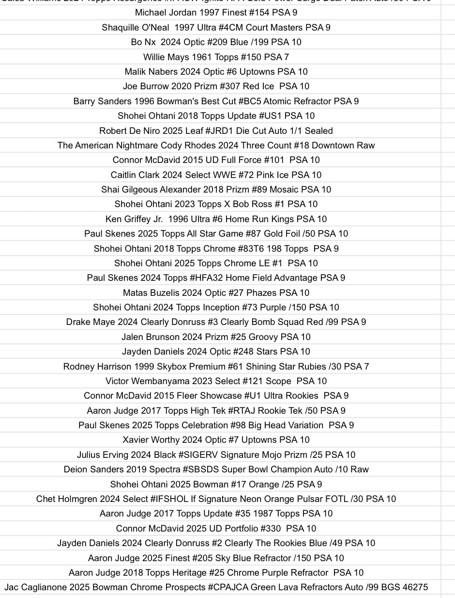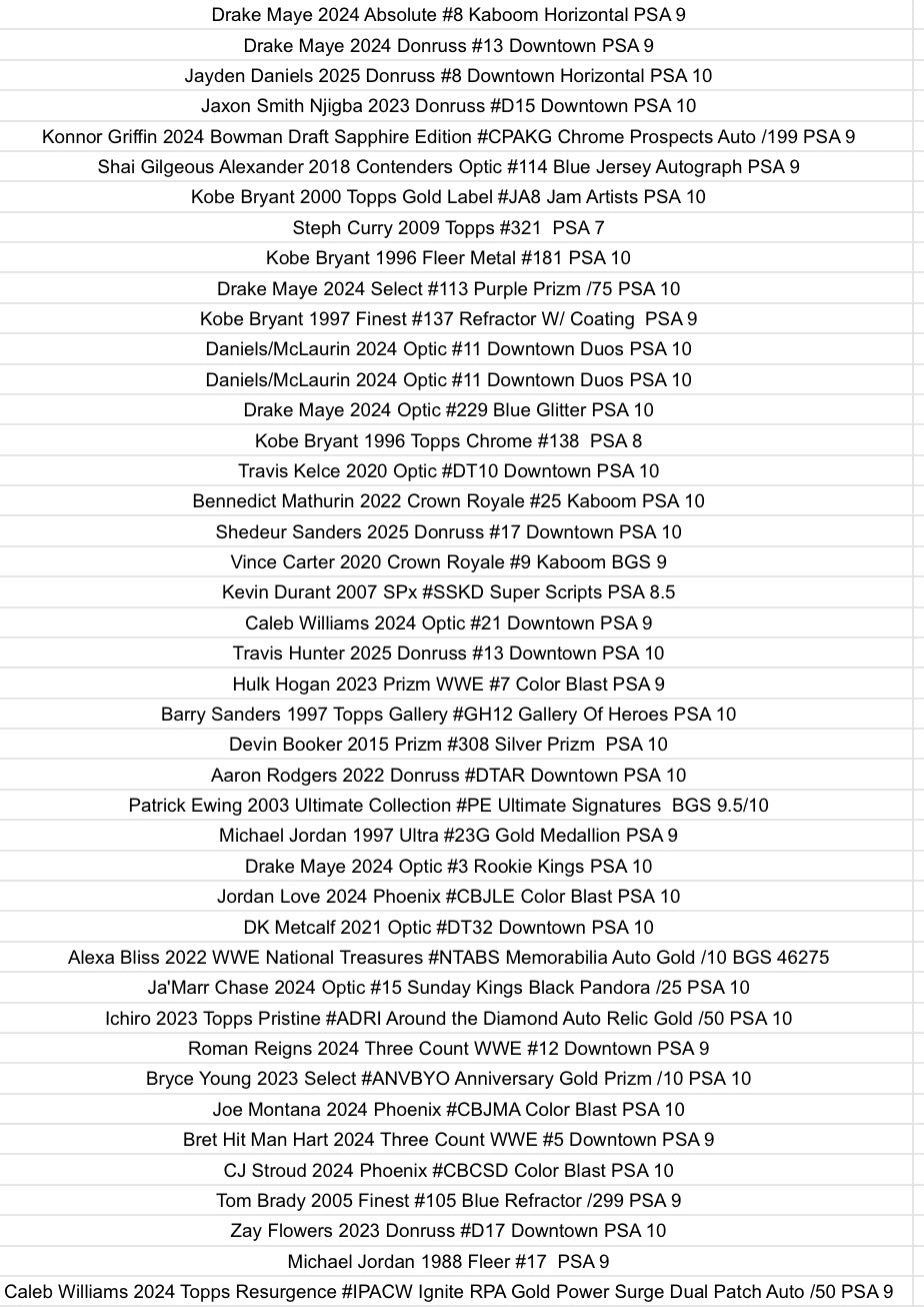 Multi-sport product 1 graded or encased trading card featuring all the hottest names in sports. Chase unique and exciting cards of players such as Aaron Judge, Shohei Ohtani, Lebron James, Michael Jordan, Patrick Mahomes, Tom Brady, Jayden Daniels, Victor Wembanyama, Jalen Hurts, Amen Thompson, Paul Skenes and more stars of yesterday, today and tomorrow!